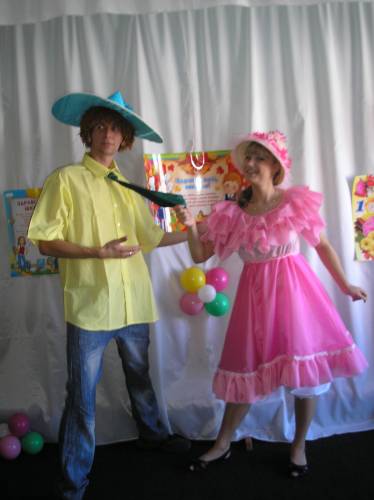 Незнайка и Кнопочка. Кнопочка- платье комбинированное из креп-сатина. Шляпв соломенная, панталончики. Незнайка-рубашка,галстук, шляпа из поролона.